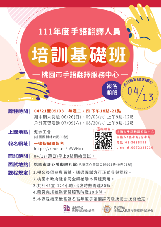 為保障聽語障市民於洽公、社會參與或溝通協調等基本權益,進而建立無障礙溝通環境,邀請對手語有興趣且願意接受手語翻譯訓練之社會大眾參與培訓 課程自111年4月21日起至111年9月3日假桃園市水泥工會辦理。詳情可至課程網址(http://www.tysltsc.xcom.tw/news/?id=2325)查看並報名。