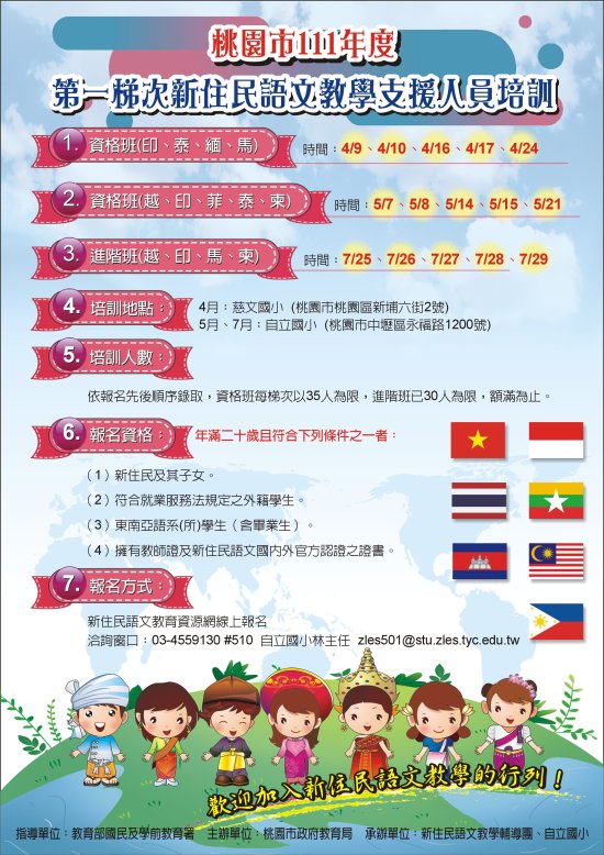 轉知桃園市教育局辦理「111年度第一梯次新住民語文教學支援人員培訓」調整開班日期一案