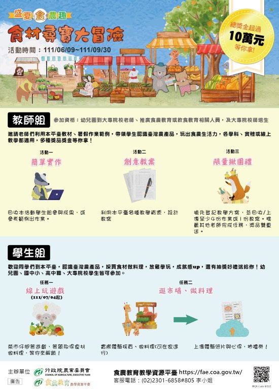 四、 | 為使大家孰悉平臺功能,該會舉辦「盛夏食農趣:食材尋寶大冒險」活動,總獎金超過10萬元,歡迎各級學校師生、食農老師及大專院校師培生踴躍參加。 |