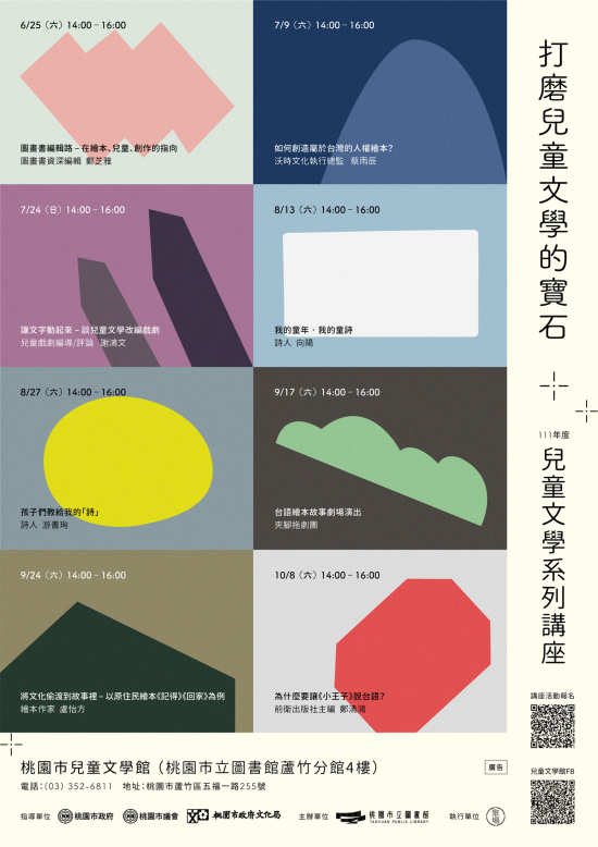 一、桃園市立圖書館為推廣兒童文學,開啟多元視野,提升學童想像力及閱讀能力,規劃於111年6月25日至10月8日期間辦理8場精彩講座,地點於桃園市兒童文學館(桃園市蘆竹區五福一路255號4樓),參加6月25日(六)講座即可獲得旅行提袋文創品1份,歡迎蒞臨參加。
