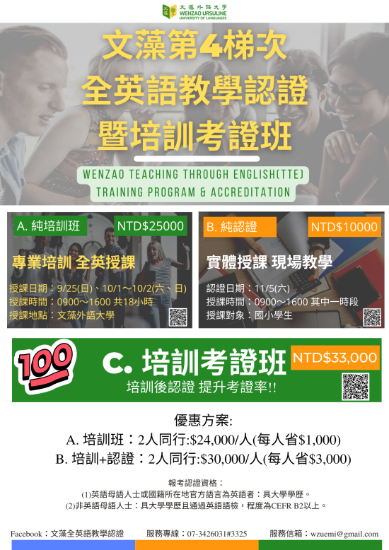 (一) 為台灣首創之全英語教學師資認證暨培訓課程(全英語授課)。