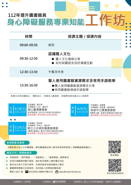 二、為提升圖書館員身心障礙服務專業素養,特規劃本(112)年4至6月於國立臺灣圖書館、國立公共資訊圖書館及高雄市立圖書館辦理旨揭實體工作坊及線上專題學習課程。
