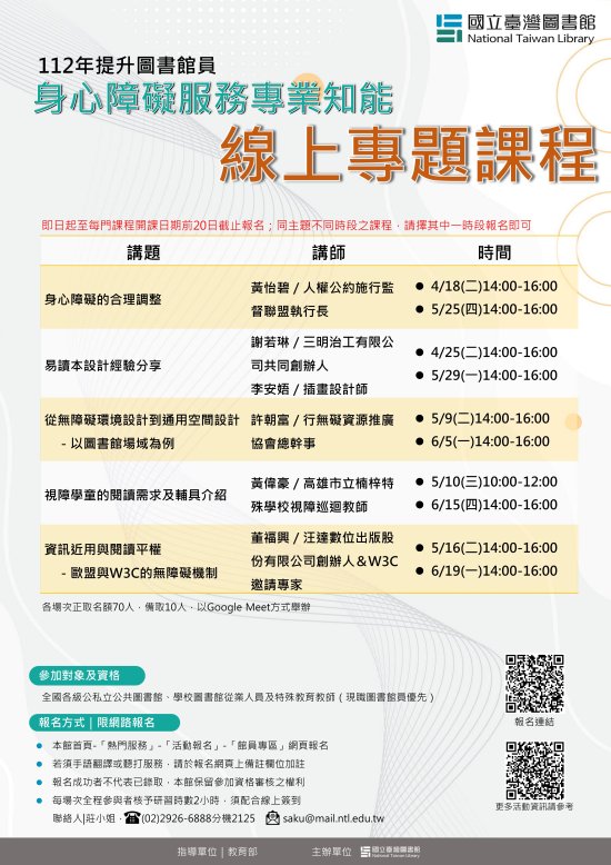 五、課程詳細資訊歡迎參閱計畫書或逕至國立臺灣圖書館網站最新消息(https://www.ntl.edu.tw)項下查詢下載。