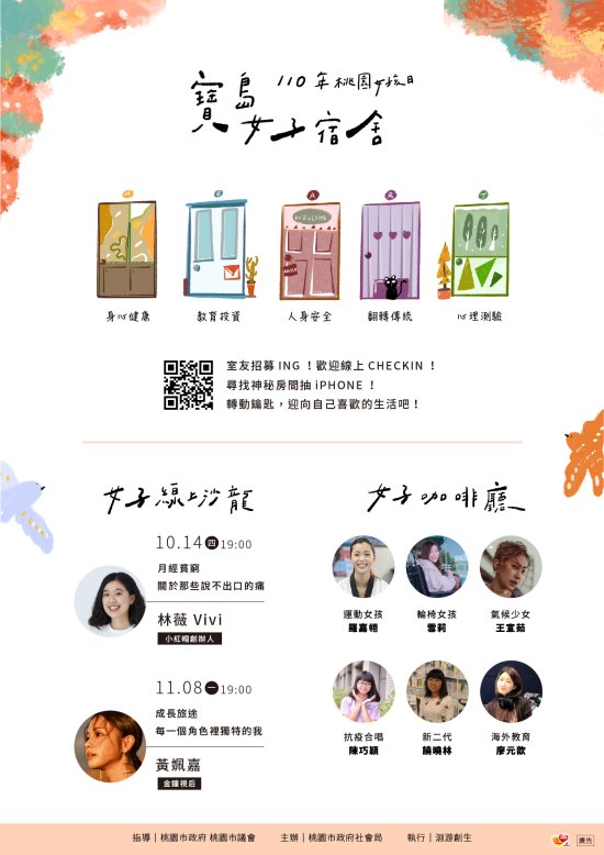 三、其中,女子咖啡廳邀請東奧跆拳道銅牌得主羅嘉翎、輪椅女孩雪莉等6位寶島女孩,以自身故事鼓勵女孩認同自己獨特價值;另辦理2場女子線上沙龍,一同聊聊女孩成長過程的小祕密,線上沙龍資訊如下: