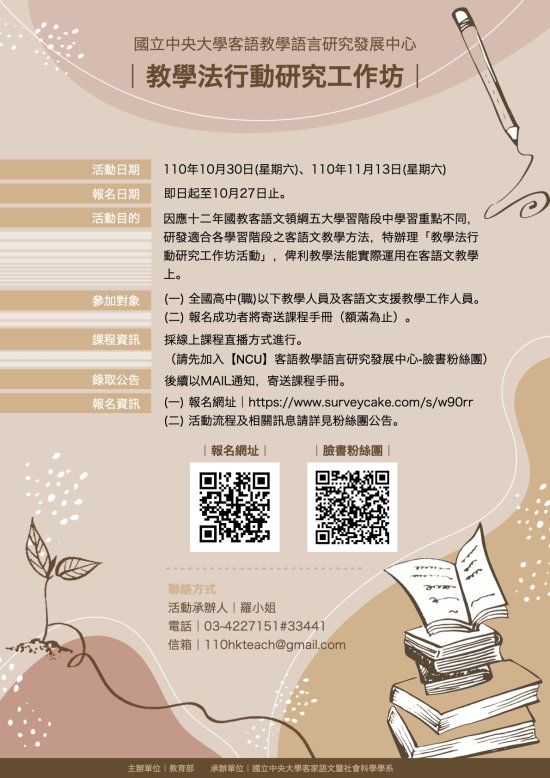 轉知國立中央大學客語教學語言研究發展中心訂於110年10月30日(星期六)及110年11月13日(星期六)線上辦理「教學法行動研究工作坊」。