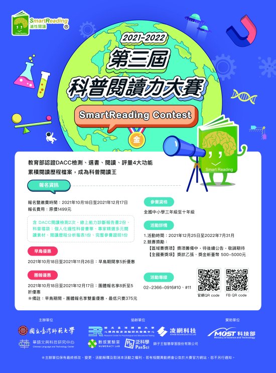 一、本次「2021-2022科普閱讀力大賽」由科技部贊助,國立臺灣師範大學華語文與科技研究中心主辦。擬邀請國小三年級至六年級、國中七年級、八年級與高中十年級學生參加。